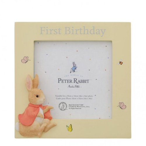 This charming Flopsy birthday photo frame is the perfect place to display a picture from a first birthday celebration and is sure to earn a place of honour on a table top or mantel. Complete with original illustrations from the Beatrix Potter stories. Photo frame fits square sized photos. Packaged in Beatrix Potter branded gift box.